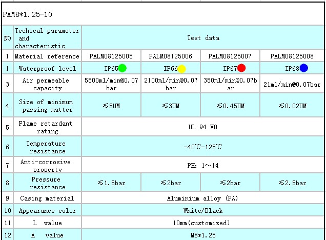 M8x1.25-10 Aluminium alloy screw vent is also called threads, respirator, waterproof breather valve.All of membrane materials of the product are imported from the USA.The casing is fabricated and formed with Aluminium alloy material. Membrane material and casing are integrated together with special process. It has characteristics such as stable performance, simple installation, long service time, high waterproof and air permeable performance and so on.