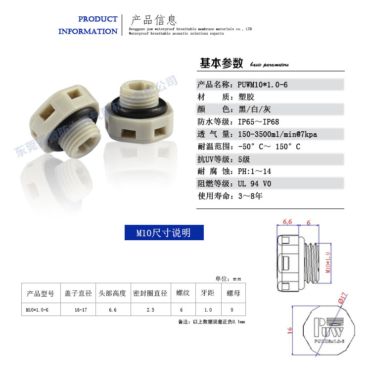 M10防水透氣閥產品膜材全部采用美國進口材料,外殼是PC原材料注塑成型的,外套耐高溫硅膠O型圈。膜材與外殼通過特殊工藝結合在一起,具有性能穩定,安裝簡單,使用時間長,防塵防水透氣性能高等特征。
