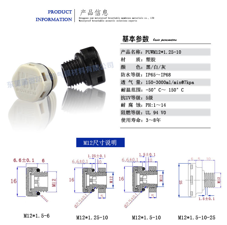 PCM12*1.25-10防水透氣閥又稱防水呼吸器,本產品膜材全部采用美國進口材料,外殼進口PC材料壓鑄成型,膜料與外殼通過特殊工藝結合在一起,具有性能穩定,安裝簡單,使用時間長,防水透氣性能高等特征。