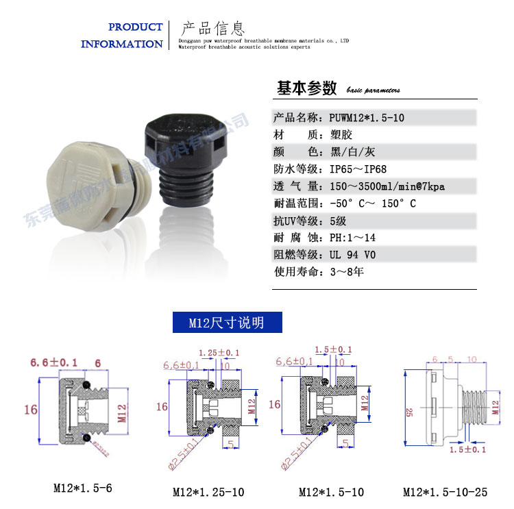 PCM12*1.5-10防水透氣閥又名螺紋型呼吸器,本產(chǎn)品膜材全部采用美國(guó)進(jìn)口材料,外殼進(jìn)口PC材料壓鑄成型,膜料與外殼通過特殊工藝結(jié)合在一起,具有性能穩(wěn)定,安裝簡(jiǎn)單,使用時(shí)間長(zhǎng),防水透氣性能高等特征; 廣泛應(yīng)用于電子,通訊,太陽(yáng)能,燈飾等行業(yè)。