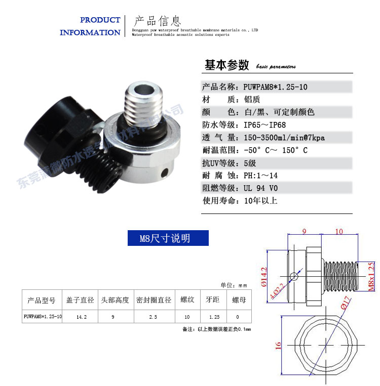 PAM8*1.25-10對邊16鋁合金防水透氣閥又名螺紋型呼吸器,本產品膜材全部采用美國進口材料,外殼鋁合金材料加工成型,膜料與外殼通過特殊工藝結合在一起,具有性能穩定,安裝簡單,使用時間長,防水透氣性能高等特征。