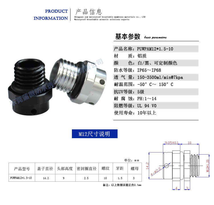 PAM12*1.25-10防水透氣閥又名螺紋型呼吸器,本產(chǎn)品膜材全部采用美國進口材料,外殼鋁合金材料加工成型,膜料與外殼通過特殊工藝結(jié)合在一起,具有性能穩(wěn)定,安裝簡單,使用時間長,防水透氣性能高等特征。