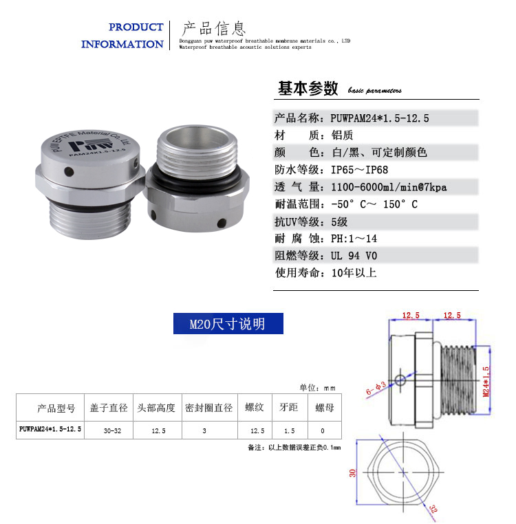 PAM24*1.5-12.5鋁質防水透氣閥又名螺紋型呼吸器,本產品膜材全部采用美國進口材料,外殼鋁合金材料加工成型,膜料與外殼通過特殊工藝結合在一起,具有性能穩定,安裝簡單,使用時間長,防水透氣性能高等特征。