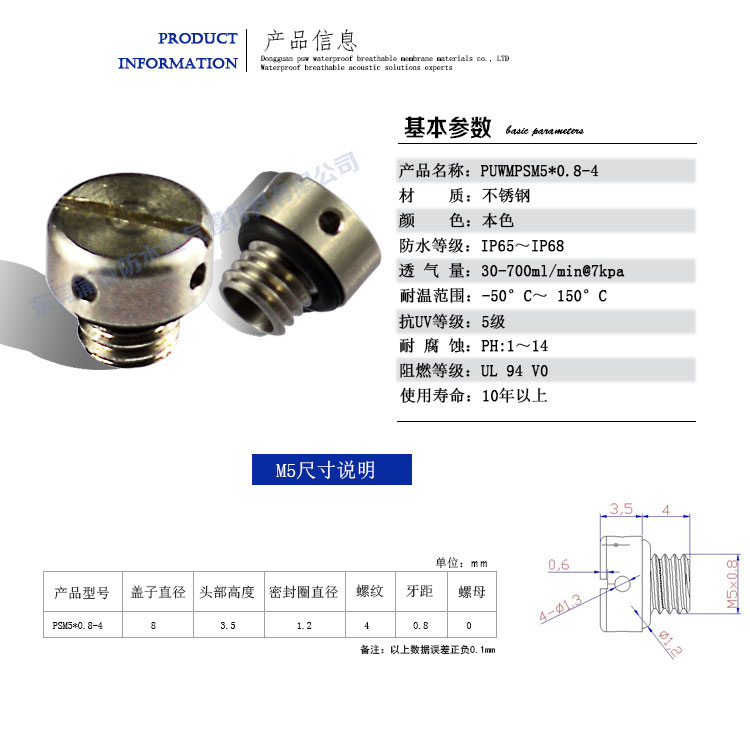 PSM5x0.8-4不銹鋼防水透氣閥產品膜材全部采用美國進口材料,不銹鋼外殼材料加工成型,膜片與外殼通過特殊工藝結合在一起,具有性能穩定,安裝簡單,使用時間長,防水透氣性能高等特征。
