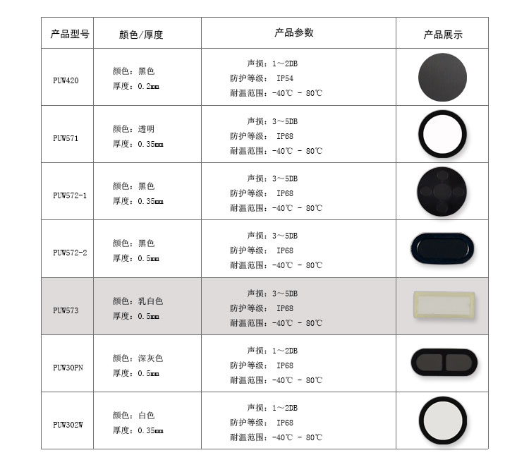 此產品特性為防塵防水透聲,用于各類防水手機,防水相機及防水電子產品上,即防塵防水同時也不影響其音質。